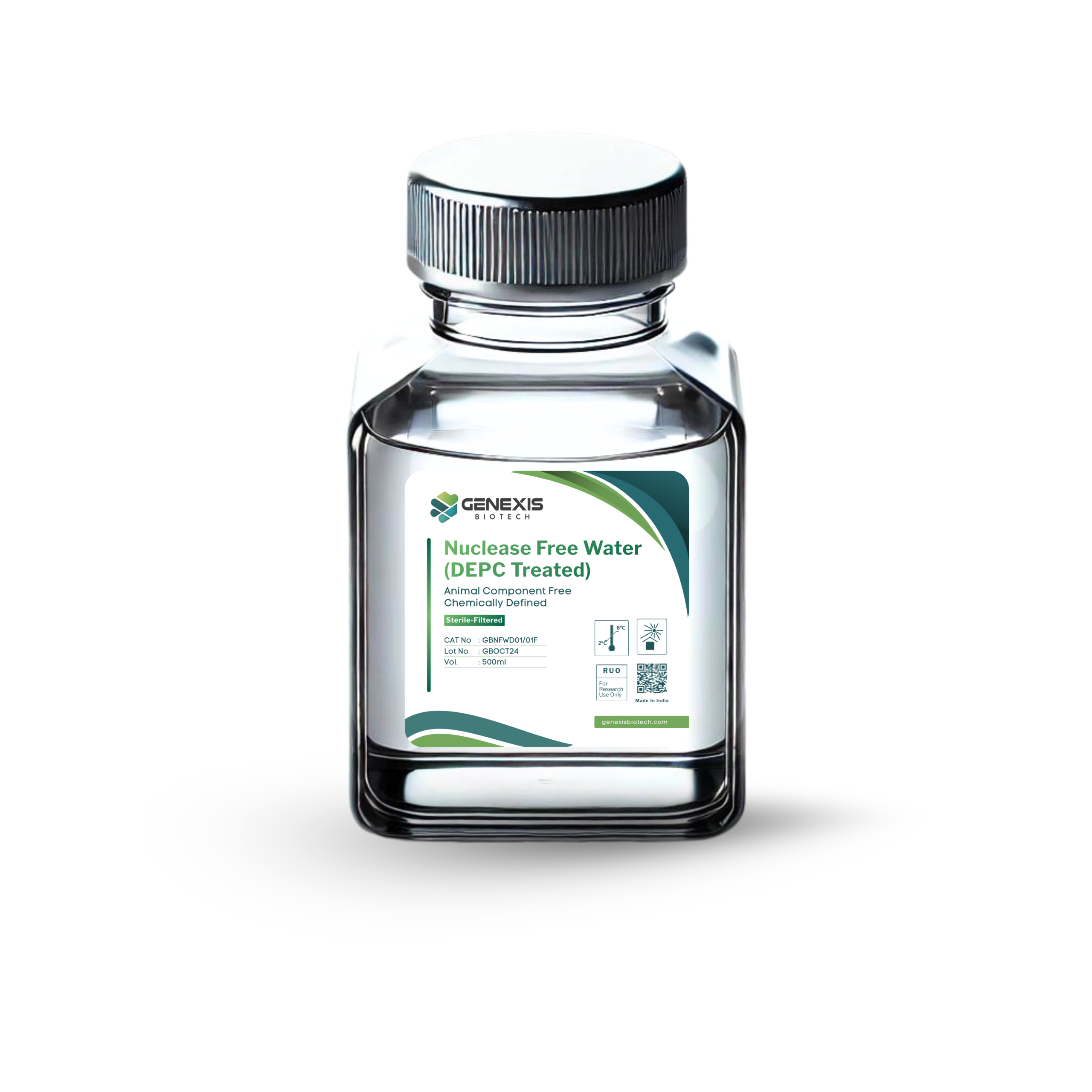 Nuclease-free water (DEPC treated) is ultra-pure water that has been treated with diethyl pyrocarbonate (DEPC) to inactivate RNases, ensuring that it is free from contaminants that could degrade RNA, making it suitable for use in molecular biology applications like RNA isolation, RT-PCR, and other sensitive RNA-based assays.