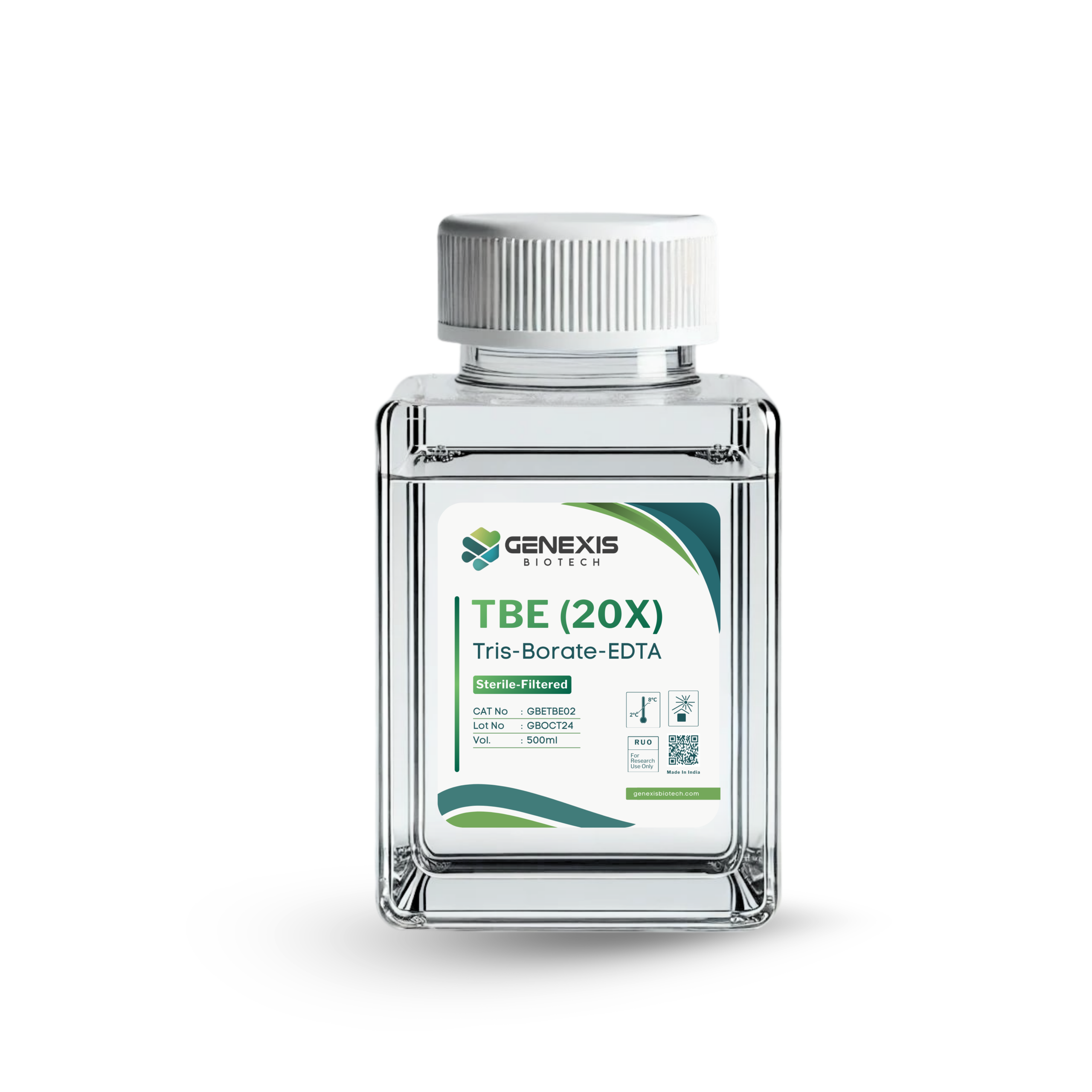 TBE (20X) is a concentrated Tris-Borate-EDTA buffer used in electrophoresis to separate nucleic acids. It ensures high-resolution DNA and RNA migration with stable pH and conductivity.